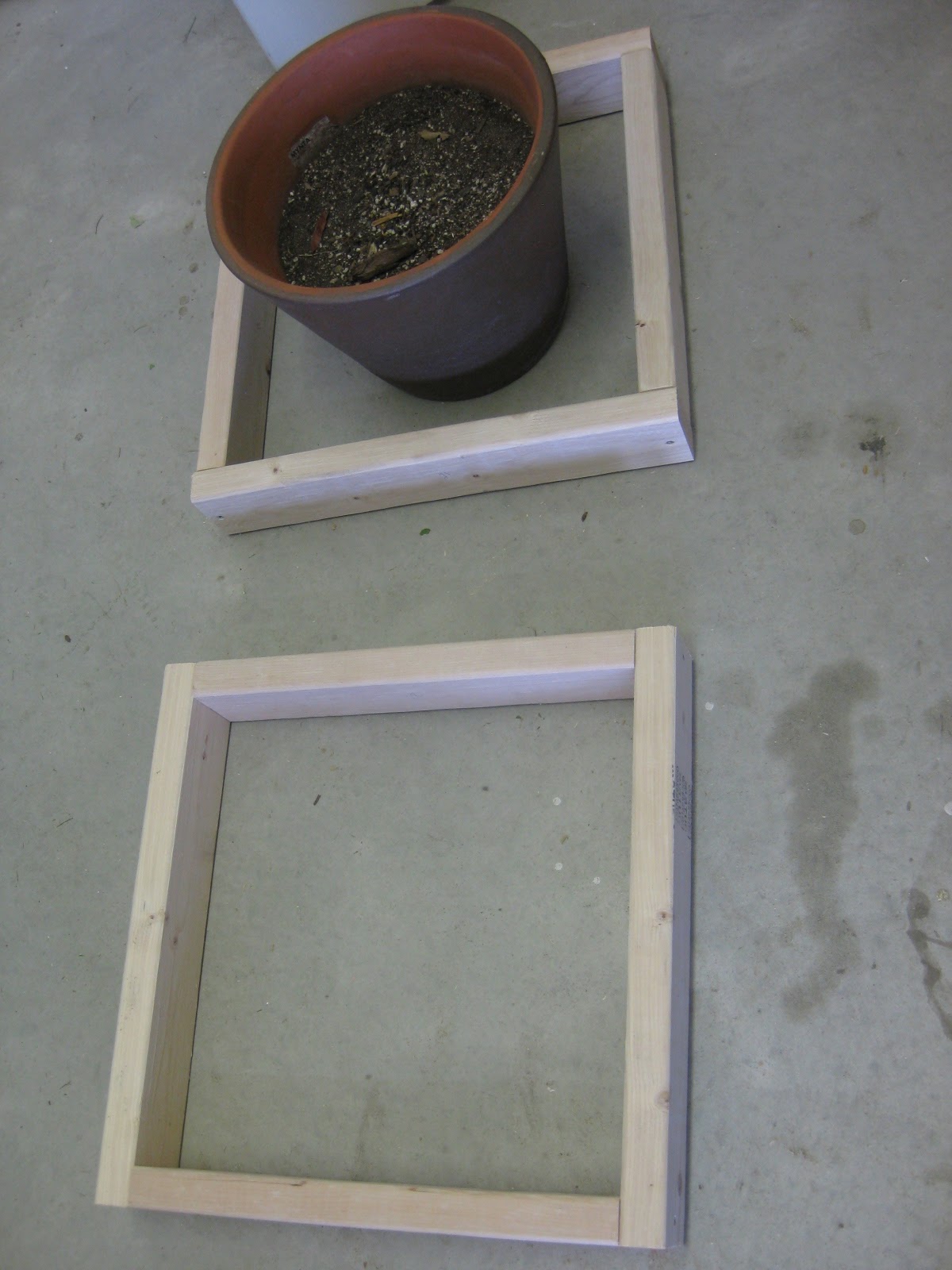 I started by cutting 2x4's to create two squares (size varies, I did mine to accommodate the size of my pot) -